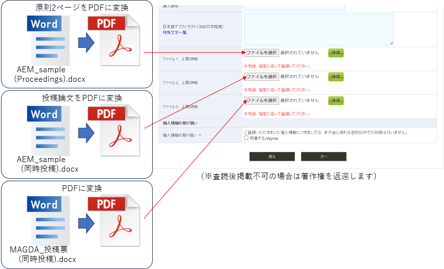プロシーディングス2ページと査読論文を分けて投稿してください。投稿時にプロシーディングスの著作権を譲渡していただき,査読論文は採択が決まった時点で譲渡していただきます。以下のサンプルフォームを参考に登録してください。